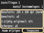 Om een instelling te bewerken:Selecteer de instelling die u wilt bewerken  verander de instelling  tik op <Toepassen>  <Ja>.