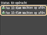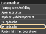 Schakel deze optie in als u RX-resultaatrapporten wilt afdrukken wanneer er documenten in het geheugen worden opgeslagen. Tik op <Aan> om rapporten af te drukken. U moet ook <RX-resultaatrapport> instellen op <Aan>.