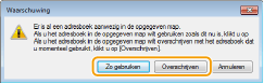 Als er al adresboekgegevens aanwezig zijn in de in stap 5 opgegeven opslaglocatie, wordt het volgende bericht weergegeven. Als u het bestaande adresboek wilt gebruiken, klikt u op [Zo gebruiken]. Als u het bestaande adresboek wilt overschrijven met het huidige adresboek, klikt u op [Overschrijven].