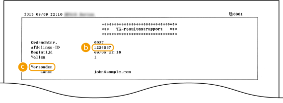 In het geval van e-mail geeft een TX-resultaatrapport informatie over de transmissie tussen het apparaat en de mailserver, niet tussen het apparaat en de bestemming. Zelfs als de transmissie mislukt, wordt er geen driecijferige foutcode afgedrukt. Als u de foutcode wilt controleren, drukt u een communicatiebeheerrapport af (