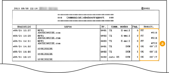 Er wordt een foutcode weergegeven). In het geval van e-mail geeft een communicatiebeheerrapport informatie over de transmissie tussen het apparaat en de mailserver, niet tussen het apparaat en de bestemming.
