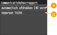 Selecteer <Aan> om afzonderlijke rapporten af te drukken voor verzonden en ontvangen documenten en <Uit> om verzend- en ontvangstgegevens te combineren in één rapport.