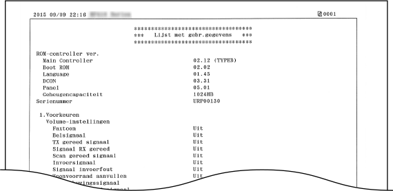 De <Lijst met gebruikersgegevens> bevat geen instellingen voor <Netwerkinstellingen> en <Instellingen Systeembeheer>, en slechts een gedeelte van de instellingen voor <Faxinstellingen>. Als u alle instellingen wilt controleren, inclusief de <Netwerkinstellingen> en <Instellingen Systeembeheer>, drukt u de <Gegevenslijst systeembeheerder> af.