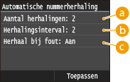 Kies deze optie om instellingen op te geven voor automatische nummerherhaling, een functie waarmee een faxnummer na enkele minuten automatisch opnieuw wordt gekozen als de eerste poging is mislukt omdat de lijn bezet is. U kunt opgeven hoe vaak het apparaat het nummer opnieuw kiest en de tijd tussen de pogingen voor nummerherhaling.