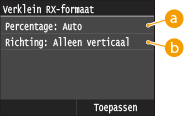 Hiermee kunt u instellingen opgeven voor het verkleinen van een ontvangen document. U kunt een verkleiningspercentage selecteren dat automatisch wordt toegepast om het ontvangen document te verkleinen tot het formaat van het geladen papier. U kunt ook een percentage selecteren in een lijst.