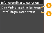 Wilt u Tonerstatus niet gebruiken, selecteer dan <Uit>. Wilt u voorkomen dat door middel van een knop, die wordt weergegeven in Tonerstatus, tonercartridges kunnen worden gekocht, selecteer dan <Aan> en vervolgens <Uit>.