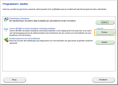 Klik op [Starten] voor [Canon MF/LBP-assistent draadloze verbinding instellen].