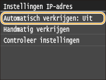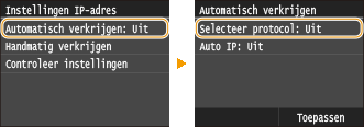 ![]() Als <Aan> wordt weergegeven, tikt u op <Automatisch verkrijgen> en stelt u zowel <Selecteer protocol> als <Auto IP> in op <Uit>.