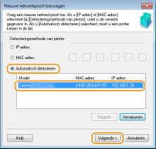 Selecteer [Automatische detectie], selecteer het apparaat als dit is gevonden en klik op [Volgende].