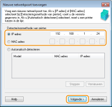 Klik op [Vernieuwen]. Als het probleem blijft optreden, selecteert u [IP-adres] of [MAC-adres], voert u het IP-adres of MAC-adres van het apparaat (Netwerkinstellingen weergeven) in en klikt u op [Volgende].