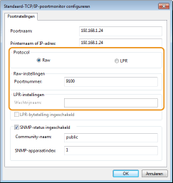 Selecteer [RAW] of [LPR] onder [Protocoltype] en verander het [Poortnummer].