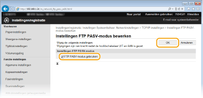 Of de PASV-stand wordt gebruikt voor FTP hangt af van uw netwerkomgeving en de instellingen op de FTP-server waar gegevens naartoe worden verzonden. Neem voor meer informatie contact op met uw Netwerkbeheerder.
