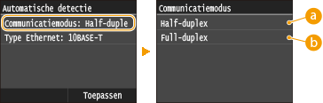 tik op <Half-duplex> of <Full-duplex>.![]() <Half-duplex>In deze modus worden er afwisselend gegevens verzonden en ontvangen. Selecteer deze modus als het apparaat is aangesloten op een netwerkapparaat dat half duplex gebruikt.