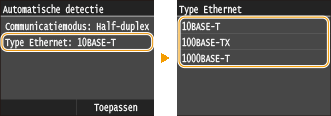 selecteer het type Ethernet.![]() ![]() Als <Communicatiemodus> is ingesteld op <Half-duplex>, kunt u <1000BASE-T> niet selecteren.