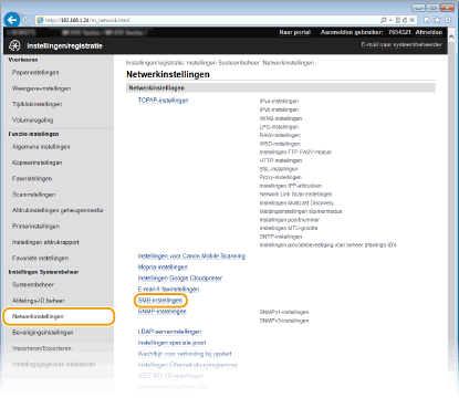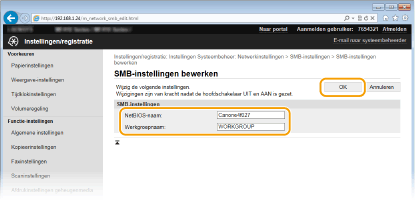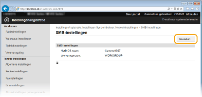 SMB (Server Message Block) is een protocol voor het delen van bronnen, zoals bestanden en printers, met meerdere apparaten in een netwerk. Het apparaat maakt gebruik van SMB om gescande documenten op te slaan in een gedeelde map. Afhankelijk van het netwerk, moet u de NetBIOS-naam en een werkgroepnaam instellen.