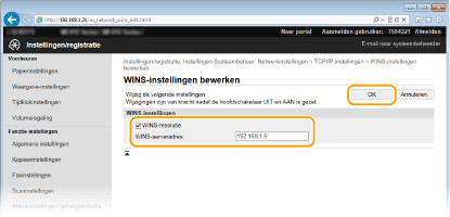 Schakel het selectievakje [WINS-resolutie] in, geef de vereiste instellingen op en klik op [OK].