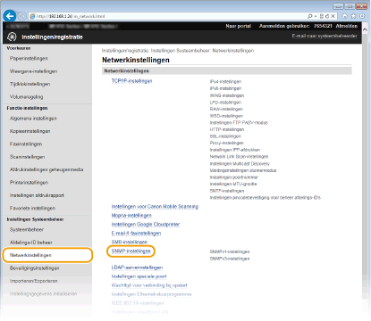 SNMP (Simple Network Management Protocol) is een protocol voor het bewaken en aansturen van communicatieapparaten in een netwerk dat werkt met MIB (Management Information Base). De machine ondersteunt SNMPv1 en SNMPv3 met extra beveiliging. U kunt de status van de machine controleren vanaf een computer wanneer u documenten afdrukt of de UI op afstand gebruikt. U kunt SNMPv1 of SNMPv3 inschakelen, of beide versies tegelijk. Geef voor elke versie de instellingen op die aansluiten bij de inrichting en functie van uw netwerkomgeving.
