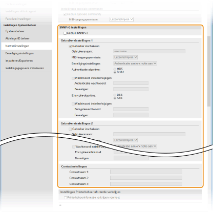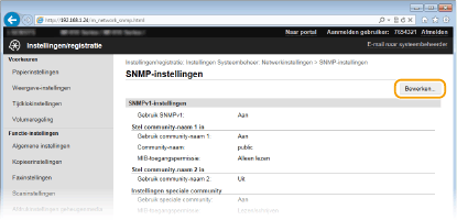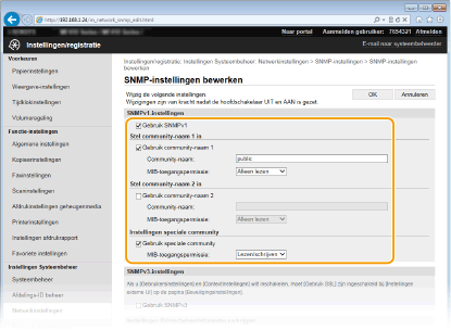 Als beide versies van SNMP zijn ingeschakeld, is het raadzaam de MIB-toegangsmachtigingen in SNMPv1 in te stellen op [Alleen lezen]. U kunt de toegangsmachtigingen voor MIB afzonderlijk instellen voor SNMPv1 en SNMPv3 (en voor elke gebruiker in SNMPv3). Als u [Lezen/schrijven] (volledige toegang) selecteert in SNMPv1, heeft dit gevolgen voor de beveiligingsfuncties van SNMPv3 omdat de meeste instellingen van het apparaat kunnen worden gewijzigd met SNMPv1.