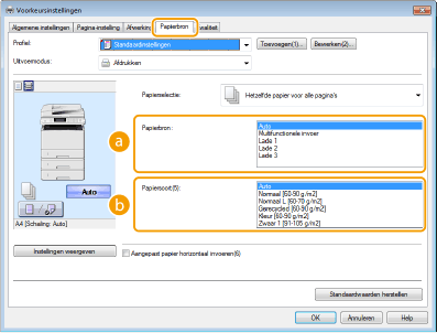 Als u <Prioriteit stuurprogramma-instellingen bij afdrukken> instelt op <Aan>, kunt u afdrukken vanuit de papierbron die is gedefinieerd in het printerstuurprogramma, ongeacht de papierinstellingen op het apparaat. Prioriteit stuurprogramma-instellingen bij afdrukken