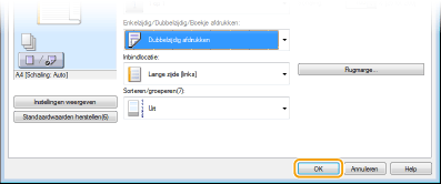 Klikbare UIOp de voorbeeldafbeelding kunt u gemakkelijk, op intuïtieve wijze, instellingen zoals de paginalay-out en inbindpositie opgeven. Klik voor meer informatie op [Help] in het scherm van het printerstuurprogramma.