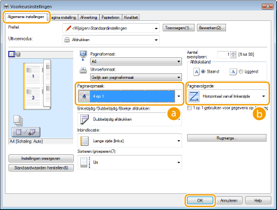 U kunt meerdere pagina's afdrukken op één vel papier. Zo kunt u vier of negen pagina's afdrukken op één vel door [4 op 1] of [9 op 1] te gebruiken. Gebruik deze functie als u papier wilt besparen of een document wilt bekijken als miniaturen.