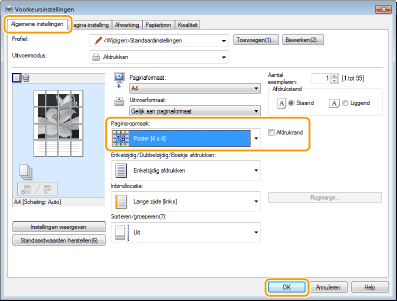 Selecteer bij [Pagina-opmaak] de afmetingen van de poster (bijvoorbeeld, [Poster [2 x 2]])