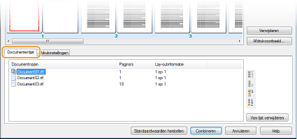 Klik op het tabblad [Documentenlijst] om de documenten weer te geven die u hebt toegevoegd in stappen 1 - 4. U kunt documenten verwijderen door deze te selecteren in de lijst en op [Van lijst verwijderen] te klikken.
