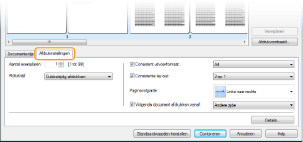Klik op het tabblad [Afdrukinstellingen] om een scherm weer te geven voor het opgeven van afdrukinstellingen zoals het aantal exemplaren of enkelzijdig of dubbelzijdig afdrukken. De instellingen in dit scherm worden voor de volledige afdruktaak gebruikt.