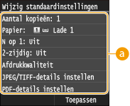 drukt. Als u deze standaardinstellingen afstemt op de bewerkingen die u regelmatig uitvoert, kunt u tijd besparen doordat u niet steeds dezelfde instellingen hoeft op te geven als u gaat afdrukken.