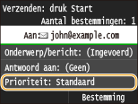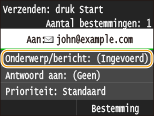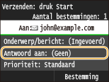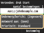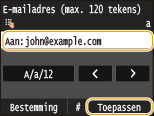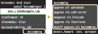 Als u meer bestemmingen opgeeft, moeten de tweede en de volgende bestemmingen worden geregistreerd in het Adresboek of in een LDAP-server. Voor Cc en Bcc kunt u uitsluitend bestemmingen opgeven die worden worden geregistreerd in het Adresboek. Om het Adresboek of een LDAP-server te gebruiken, moet u eerst de vereiste registratieprocedure voltooien.
