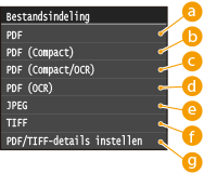 U kunt het bestandsformaat selecteren waarnaartoe documenten worden gescand: PDF/JPEG/TIFF. Voor PDF kunt u een sterk gecomprimeerd PDF-bestand met een gereduceerd bestandsformaat selecteren of een op tekst doorzoekbaar PDF-bestand voorbereid door OCR (Optical Character Recognition).