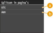 Als u JPEG selecteert in <Bestandsindeling> en probeert een document vanaf de glasplaat te scannen, kunt u slechts één pagina scannen. U kunt een document van meerdere pagina's in één keer scannen met behulp van de invoer. Iedere pagina van het document wordt als een apart bestand opgeslagen. Als u TIFF of PDF selecteert, kunt u documenten van meerdere pagina's zowel van de glasplaat scannen als met behulp van de invoer. In dat geval kunt u met behulp van Iedere pagina van een document als een bestand opslaan. opgeven of het gescande document in zijn geheel als één bestand moet worden opgeslagen of dat iedere pagina als een afzonderlijk bestand moet worden opgeslagen.
