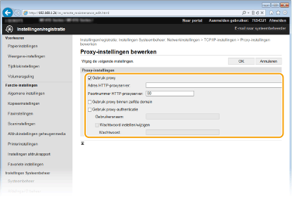 Als u het wachtwoord voor proxy-verificatie wilt instellen of wijzigen, schakelt u het selectievakje in en typt u maximaal 24 tekens voor het nieuwe wachtwoord in het vak [Wachtwoord].