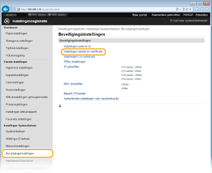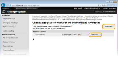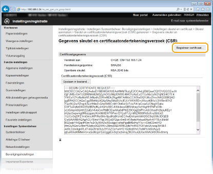 U kunt het sleutelpaar dat is gegenereerd door het Certificate Signing Request (CSR) pas gebruiken als het certificaat is geregistreerd. Registreer het digitale certificaat wanneer de certificeringsinstantie het heeft uitgegeven en volg daarvoor onderstaande procedure.