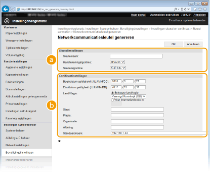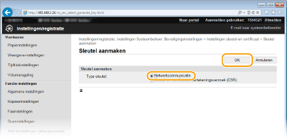 Voor versleutelde communicatie via TLS (Transport Layer Security) kunt u een sleutelpaar genereren met het apparaat. U kunt TLS gebruiken voor toegang tot het apparaat via de UI op afstand. Er kunnen maximaal vijf sleutelparen (inclusief de vooraf geïnstalleerde paren) worden gegenereerd op het apparaat. Zelf-ondertekende certificaten worden gebruikt bij sleutelparen die zijn gegenereerd in "Netwerkcommunicatie". Met een "Sleutel en certificaatondertekeningsverzoek (CSR)" (Key and Certificate Signing Request) kunt u een door een CA uitgegeven digitaal certificaat aanvragen voor het sleutelpaar dat met het apparaat is gegenereerd.