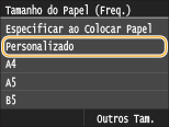 Após o registo da predefinição de papel, o ecrã de definição de papel não aparece quando o papel é colocado e é utilizada sempre a mesma definição. Se colocar um tamanho ou um tipo diferente de papel sem alterar as definições de papel, a máquina pode não imprimir corretamente. Para evitar esse problema, selecione <Especificar ao Colocar Papel> no passo 3 e depois coloque o papel.