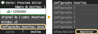Para editar ou apagar definições registadas, aceda a <Fax>  <Configurações Favoritas>  <Editar/Excluir>  <Editar> ou <Excluir> e depois siga os passos abaixo.