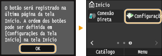 Se o Início ecrã estiver cheio e não for possível adicionar o botão, utilize <Configs.Tela Início> para eliminar botões registados ou espaços em branco.