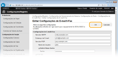 Antes de enviar correio eletrónico ou I-Faxes, utilize a UI Remota para configurar as definições detalhadas de envio e receção, tais como as definições de utilização da máquina para enviar e receber I-Faxes e as definições de autenticação POP e codificação da comunicação. Para obter as definições necessárias, contacte o seu fornecedor ou o administrador da rede.