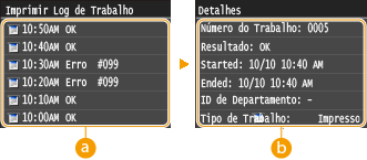 ![]() <Imprimir Log de Trabalho>Apresenta uma lista dos documentos que foram impressos. <OK> aparece quando um documento é impresso com êxito e <Erro> aparece quando um documento não é impresso por ter sido cancelado ou devido a um erro.