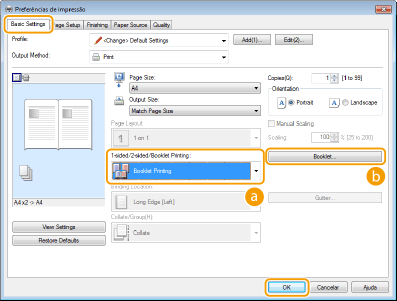 Selecione [Booklet Printing] (Impressão de Brochura) em [1-sided/2-sided/Booklet Printing] (1 Lado/2 Lados/Impressão de Brochura)