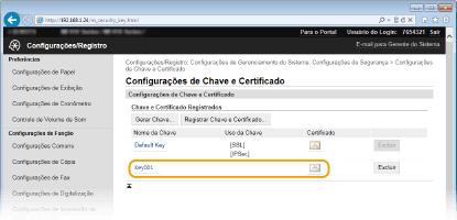Clique em [Nome da Chave] ou [Certificado] para registar o certificado.