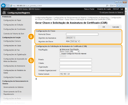 É possível criar um par de chaves com a máquina quando tal for necessário para comunicação codificada através de TLS (Transport Layer Security). Pode utilizar o protocolo TLS quando pretender aceder à máquina através da UI Remota. É possível registar até cinco pares de chaves para a máquina (incluindo os pares pré-instalados). São utilizados certificados auto assinados com pares de chaves gerados em "Comunicação de Rede". Com um "Pedido de Assinatura de Certificado e Chave (CSR)", pode pedir um certificado digital emitido por uma CA para o par de chaves gerado pela máquina.