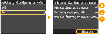 Για να αποθηκεύσετε τα ληφθέντα έγγραφα στη μνήμη, ορίστε την επιλογή <Ρυθμίσεις Κλειδώματος σε Μνήμη> σε <On>. Επίσης, μπορείτε να ορίσετε προαιρετικές ρυθμίσεις, όπως μια ρύθμιση ασφαλείας που επιβάλλει τη χρήση κωδικού πρόσβασης για το ξεκλείδωμα της λειτουργίας και μια ρύθμιση χρόνου που καθορίζει μια χρονική περίοδο της ημέρας κατά την οποία τα ληφθέντα έγγραφα θα αποθηκεύονται στη μνήμη.
