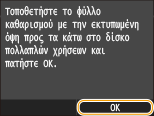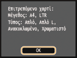 Ελέγξτε ότι το μέγεθος και ο τύπος χαρτιού που εμφανίζονται συμφωνούν με το χαρτί που έχετε τοποθετήσει στη συσκευή και αγγίξτε <OK>.