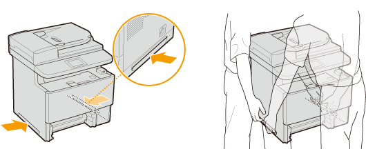 Κρατήστε τη συσκευή από τις λαβές ανύψωσης και ανασηκώστε την. Εάν έχετε τοποθετήσει τον προαιρετικό τροφοδότη χαρτιού, αφήστε τον προαιρετικό τροφοδότη χαρτιού στο πάτωμα και μετακινήστε τον αφού μετακινήσετε την κεντρική μονάδα της συσκευής.