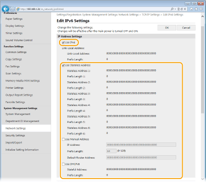 Μπορείτε να διαμορφώσετε τις διευθύνσεις IPv6 της συσκευής μέσω του Remote UI (Απομακρυσμένο περιβάλλον εργασίας). Προτού ρυθμίσετε τις διευθύνσεις IPv6, ελέγξτε τις ρυθμίσεις διευθύνσεων IPv4 (Προβολή ρυθμίσεων IPv4). Για να χρησιμοποιήσετε τις διευθύνσεις IPv6, πρέπει να ορίσετε τις σωστές διευθύνσεις IPv4. Πρέπει να γνωρίζετε ότι η λειτουργία σάρωσης που χρησιμοποιεί το πρόγραμμα οδήγησης σαρωτή ή το MF Scan Utility δεν είναι διαθέσιμη σε περιβάλλον IPv6. Η συσκευή μπορεί να χρησιμοποιήσει έως εννέα από τις παρακάτω διευθύνσεις IPv6: