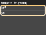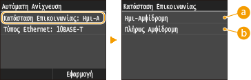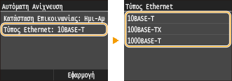 για να επιλέξετε τον τύπο Ethernet.![]() ![]() Εάν η ρύθμιση <Κατάσταση Επικοινωνίας> έχει οριστεί σε <Ημι-Αμφίδρομη>, δεν μπορείτε να επιλέξετε <1000BASE-T>.