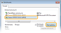 Επιλέξτε το κατάλληλο πρόγραμμα οδήγησης εκτυπωτή για τη συσκευή και έπειτα επιλέξτε [Προτιμήσεις] ή [Ιδιότητες].