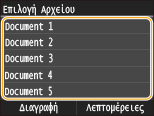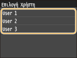 Εάν υπάρχουν στη μνήμη ασφαλή έγγραφα από δύο ή περισσότερους χρήστες, εμφανίζεται η οθόνη <Επιλογή Χρήστη> πριν από την οθόνη <Επιλογή Αρχείου>. Επιλέξτε το δικό σας όνομα χρήστη.